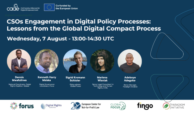 A visual shared on social media with the list of speakers for the 7 August 2024 webinar on CSOs and the Global Digital Compact. Speakers (from left): Mr Dennis Mwafulirwa, National Coordinator, Digital Rights Coalition – Malawi; Mr Kenneth Msiska, Digital Governance Coordinator, Forus; Ms Sigrid Kromann, Policy Advisor, Global Focus; Ms Marlena Wisniak, Senior Legal Consultant for Technology and Human Rights, ECNL and Mr Adeboye Adegoke, Senior Manager, Paradigm Initiative
