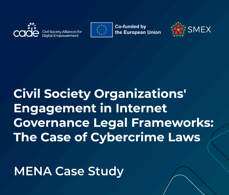 This study was conducted by SMEX, a non-profit that advocates for and advances human rights in digital spaces across West Asia and North Africa, as part of its work on the CADE project (Civil Society Alliances for Digital Empowerment), a project co-funded by the European Union. This project includes expert organizations from different regions. It aims to enhance the capacity of Civil Society organizations (CSOs) for effective advocacy in multilateral and multistakeholder internet governance (IG) processes, including cybercrime laws, tackled in this paper.