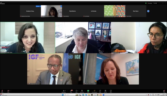 Screenshot of the recorded online dialogue, held on 31 October 2024. Clockwise from top left: Dr Stephanie Borg Psaila, Director of Digital Policy, DiploFoundation (moderator); Ms Kelly Anderson, Director for International Cyber, Digital and Emerging Technology Policy, Global Affairs Canada; Ms Samara Castro, Director, Promotion of Freedom of Expression, Digital Policies Section – Secretariat of Social Communication, Presidency of Brazil; Ms Radka Sibille, Permanent Delegation of the EU to the UN in Geneva; and Mr Chengetai Masango, Head of Office, UN IGF Secretariat